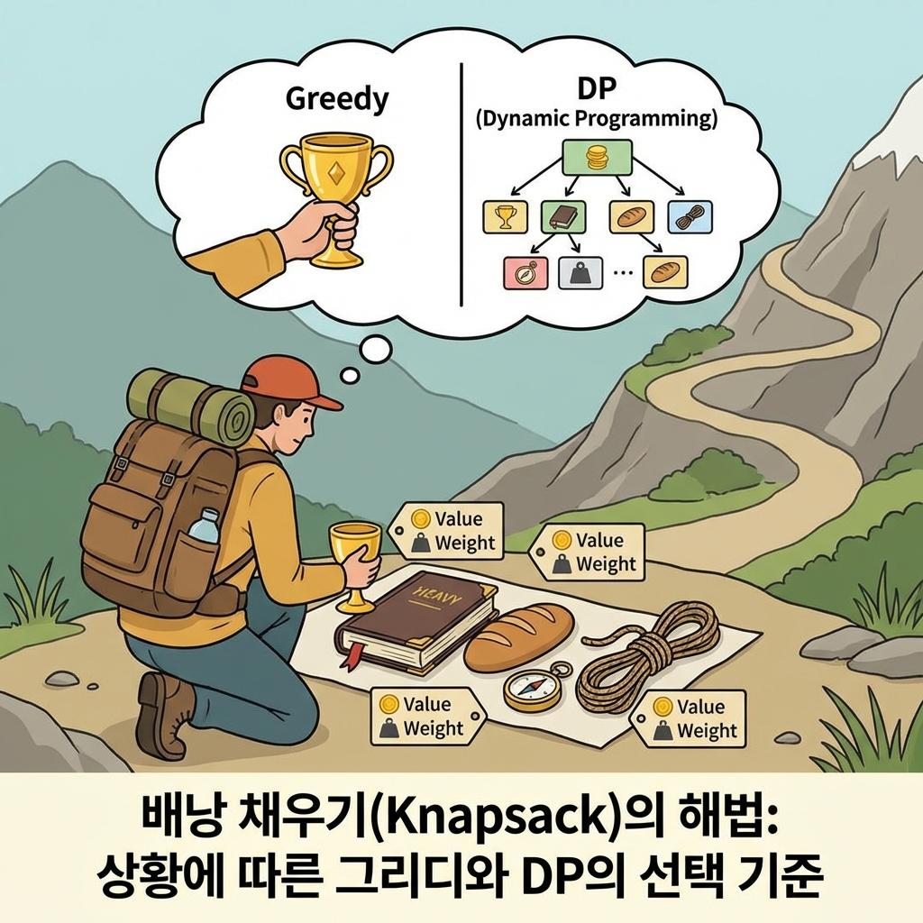 물건을 쪼갤 수 없다면 그리디 방식은 무너집니다. 가성비는 좋지만 무게가 너무 커서 배낭의 남은 공간을 애매하게 만드는 물건보다는, 가성비는 조금 떨어져도 무게 조절이 쉬운 물건들의 조합이 더 높은 가치를 낼 수 있기 때문입니다. 이때 우리는 모든 경우의 수를 체계적으로 검토하는 동적 계획법(Dynamic Programming)을 사용합니다.