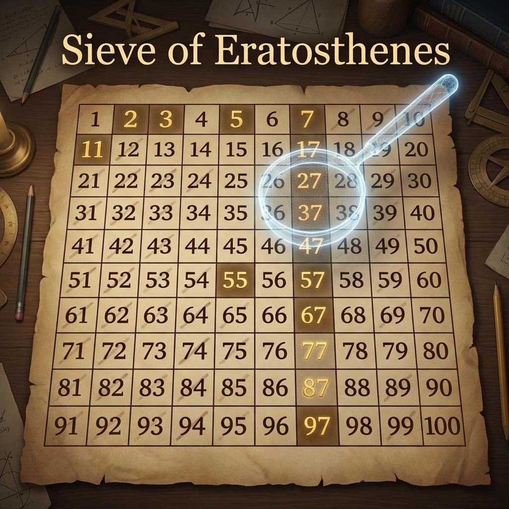 숫자 중 1과 자기 자신만으로 나누어떨어지는 '소수(Prime Number)'를 찾는 과정은 수학적 난제이자 알고리즘의 단골 소재입니다. 하나의 숫자가 소수인지 판별하는 것은 쉽지만, "1부터 1,000,000 사이의 소수를 모두 찾아라"라는 대량의 요청이 들어온다면 단순 탐색으로는 시간이 너무 오래 걸립니다. 이때 고대 그리스의 학자 에라토스테네스가 고안한 '에라토스테네스의 체(Sieve of Eratosthenes)'는 마치 고운 체로 모래를 걸러내듯 소수가 아닌 수들을 제거하여 소수만을 남기는 경이로운 효율성을 보여줍니다. 본 포스팅에서는 이 알고리즘의 동작 메커니즘과 최적화 기법을 2,500자 이상의 상세한 설명으로 기술하겠습니다.