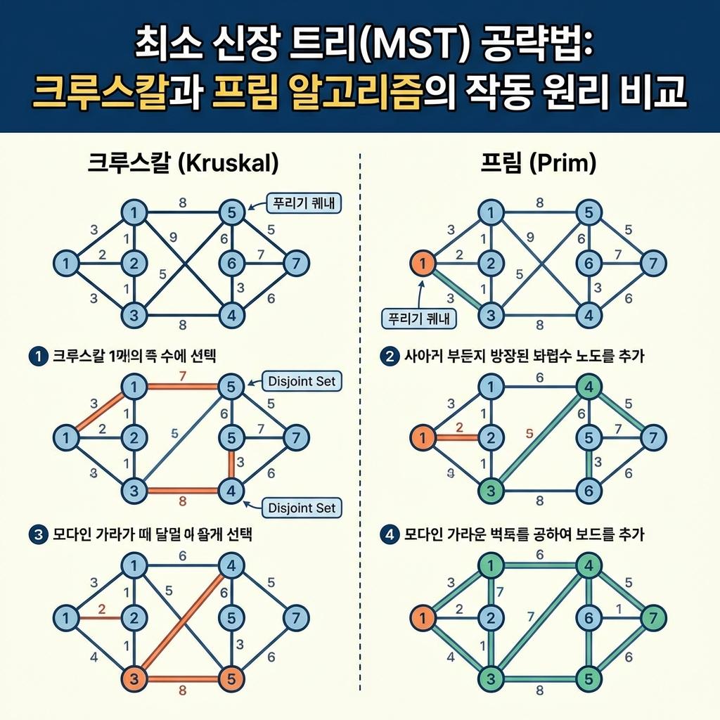 여러 도시를 연결하는 도로망을 설계하거나 광통신망을 구축할 때, 우리는 '모든 정점을 연결하되 전체 길이는 최소화'해야 하는 최적화 문제에 직면합니다. 이를 그래프 이론에서는 최소 신장 트리(Minimum Spanning Tree, MST)라고 부릅니다. MST를 구현하는 가장 대표적인 두 알고리즘인 크루스칼(Kruskal)과 프림(Prim)은 모두 그리디(Greedy) 기법을 사용하지만, 문제를 바라보는 관점이 완전히 다릅니다. 본 포스팅에서는 두 알고리즘의 매커니즘 차이와 상황별 최적의 선택 기준을 2,500자 이상의 상세한 분석으로 정리해 보겠습니다.